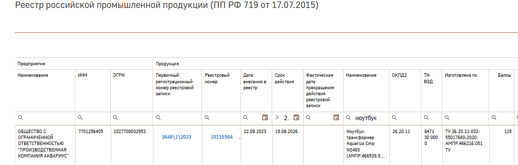 - Номер реестровой записи из евразийского реестра промышленных товаров государств – членов ЕАЭС (в том числе с информацией о совокупном количестве баллов и/или уровне радиоэлектронной продукции — при наличии);