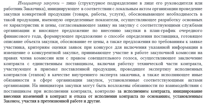 В их числе особое место занимают так называемые «инициаторы закупок», с которых, по существу, начинается процедура закупки конкретного товара, работы, услуги. Однако ни в Законе № 44-ФЗ, ни в Законе № 223-ФЗ, ни в типовом положении о контрактной службе нет упоминания о специалистах такого типа.