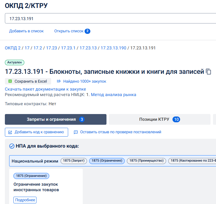 1. На этапе подготовки закупки заказчик должен определить, подпадает ли закупаемый товар, работа, услуга под требования национального режима, в том числе – ограничения закупки, для чего в первую очередь определяется соответствующий код ОКПД 2, который позволяет это проверить. Такую проверку можно эффективно произвести в ресурсах Эконом-Эксперт. https://zakupki44fz.ru См. рис. № 3 на примере блокнотов.