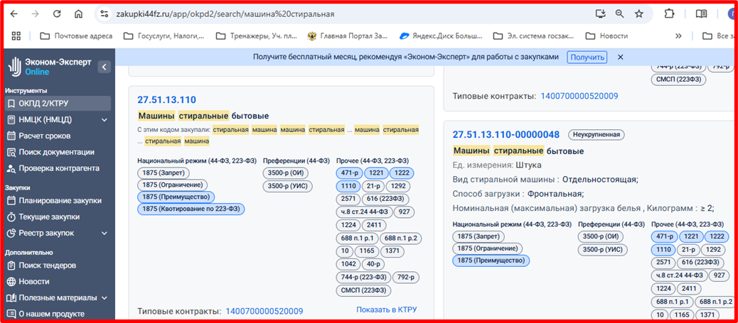 1. На этапе подготовки закупки заказчик должен определить, подпадает ли закупаемый товар, работа, услуга под требования национального режима, в том числе – преимущество закупки, для чего в первую очередь определяется соответствующий код ОКПД2, который позволяет это проверить. Такую проверку можно эффективно произвести в ресурсах Эконом-Эксперт. https://zakupki44fz.ru См. рис. № 2 на примере машины стиральной бытовой.