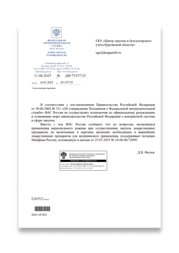 ФАС России поддерживает позицию Минфина по нац режиму для ЛП не-ЖНВЛП Опубликовано 12.08.2025 Анна Есипенко Назад к списку материалов Скачать Download is available until [expire_date] Версия Скачать 22 Размер файла 634.62 KB Количество файлов 1 Дата создания 12.08.2025 Последнее обновление 12.08.2025